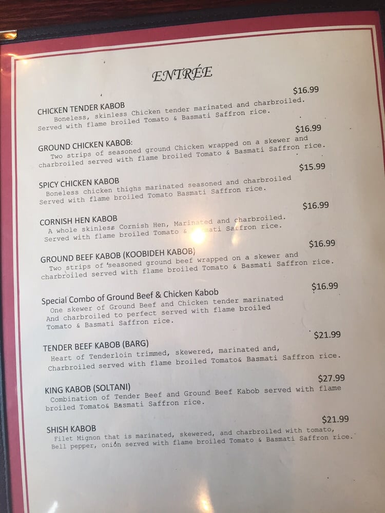 Heart of tenderloin trimmed, skewered, marinated and charbroiled served with flame broiled tomato & basmati saffron rice.