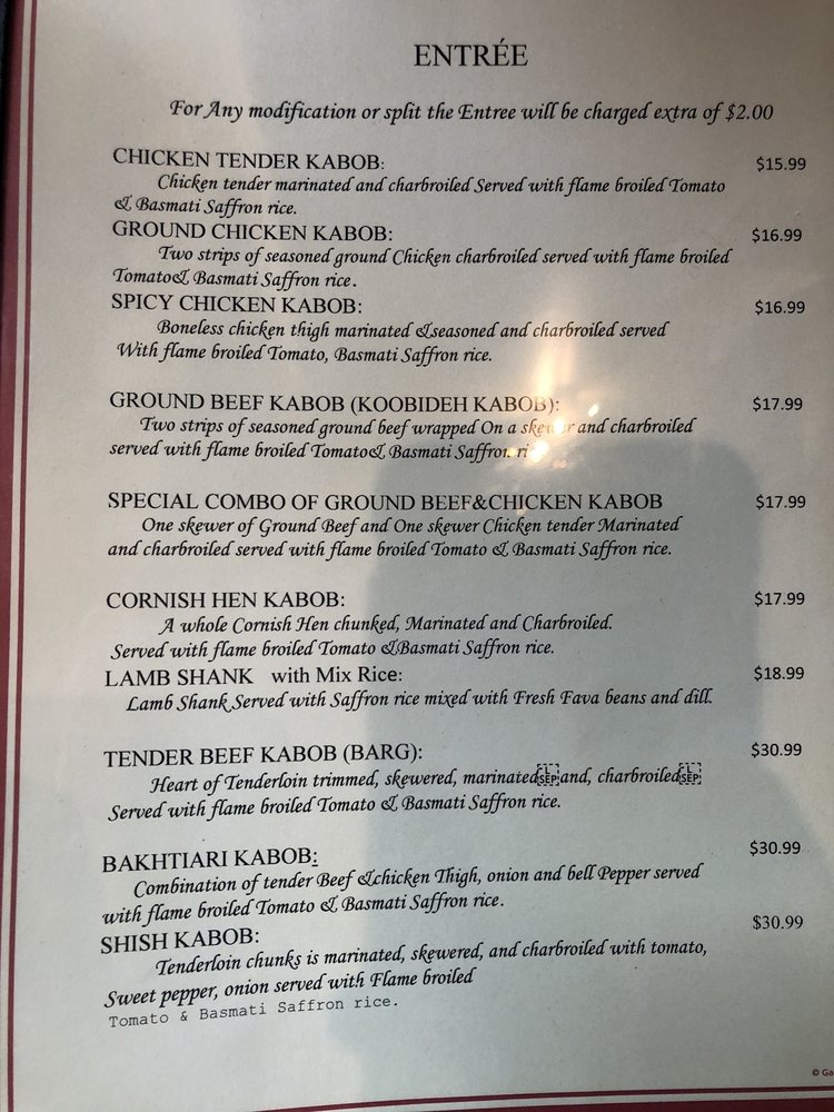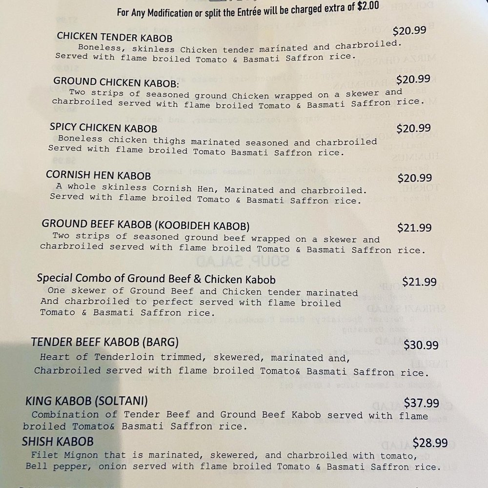 One skewer of ground beef and one skewer chicken tender marinated and charbroiled to perfect served with flame broiled tomato & basmati saffron rice.